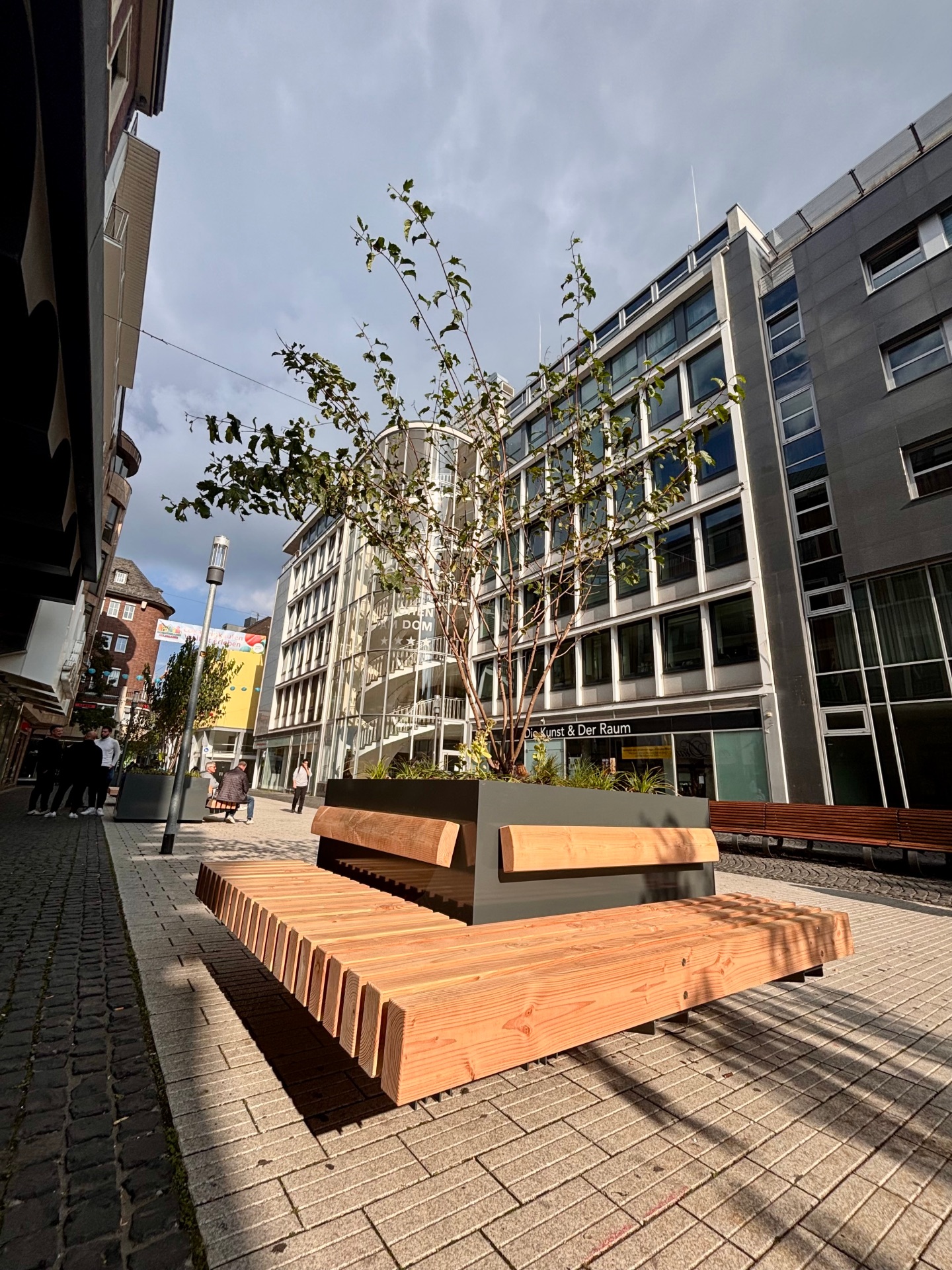 Anfang September erst zeigte die Händlerschaft mit einem Straßenfest, dass ein frischer Wind durch Dahmen- und Holzgraben weht. Erst im März 2025 hatte die Stadtverwaltung die Händler*innen und Eigentümer*innen zu einer internen Straßenkonferenz eingeladen, um alle Beteiligten an einen Tisch zu bringen. Ein zentrales Ergebnis: Die alteingesessenen und neuen Händler*innen am Dahmen- und Holzgraben haben sich als Interessengemeinschaft zusammengetan, um ihre Kräfte zu bündeln und gemeinsame Aktionen voranzutreiben – und das passiert seitdem mit viel Einsatz und Leidenschaft. Insbesondere der Dahmengraben blüht regelrecht auf – inklusive zahlreicher neuer Geschäftseröffnungen, die auch dank städtischer Förderprogramme möglich wurden. Die neuen grünen Sitzinseln tragen nun – so die Hoffnung aller Beteiligten – dazu bei, dass die spürbare Aufbruchstimmung und Belebung im Viertel weiterwachsen kann.
