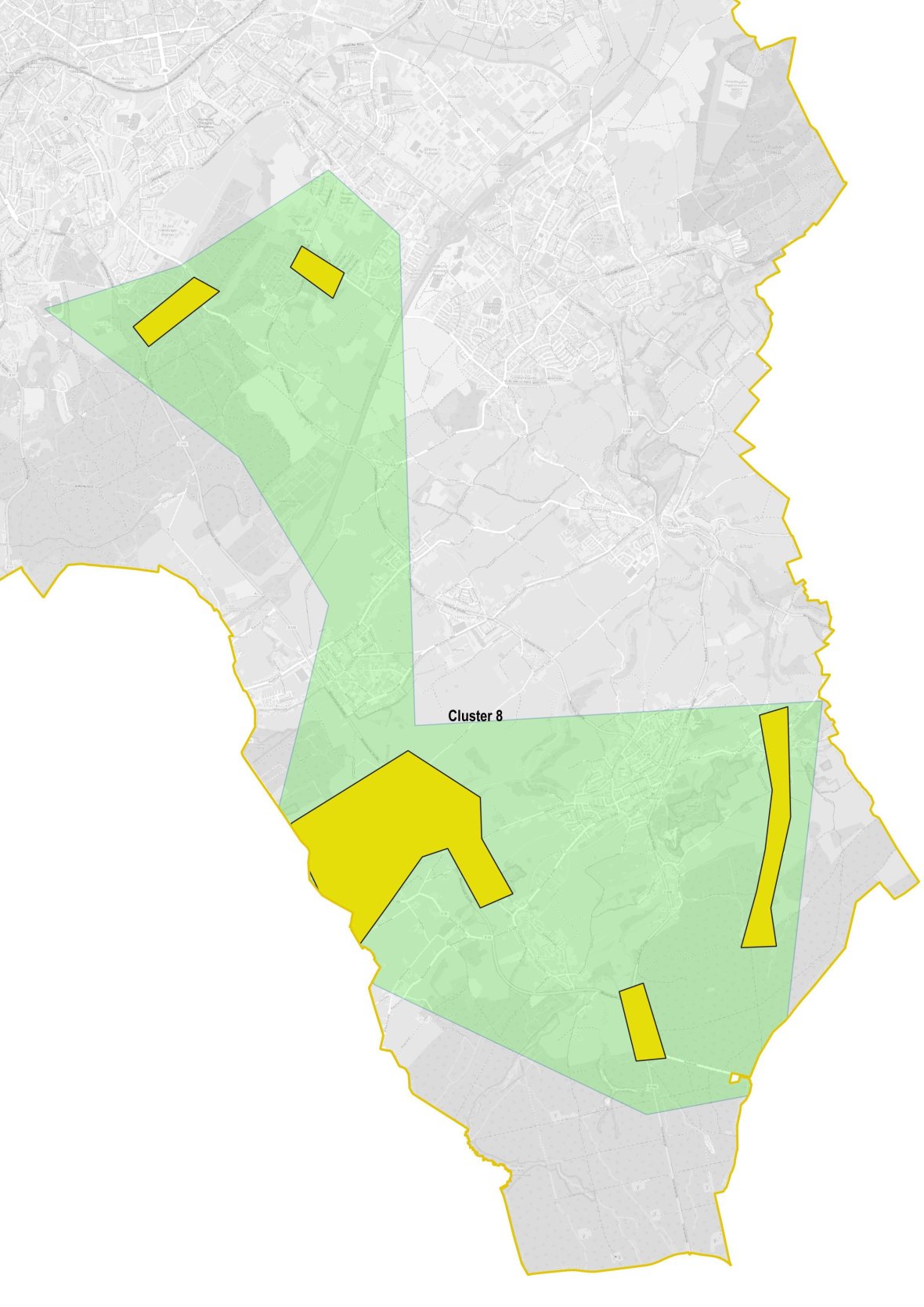Das Cluster 8 umfasste ursprünglich drei Ortslagen, zwei weitere Standorte im nördlich liegenden Gebiet von Cluster 6 wurden nachträglich mitaufgenommen. Die Ausbautrasse weist eine Länge von 9 km Neubautrasse und 2 km Nutzung von Bestandsrohr auf, womit weitere 63 Gebäude an das Glasfasernetz der NetAachen angeschlossen wurden. Durch den überwiegenden Einsatz des Spülbohrverfahrens waren keine besonderen Maßnahmen zum Baumschutz erforderlich.